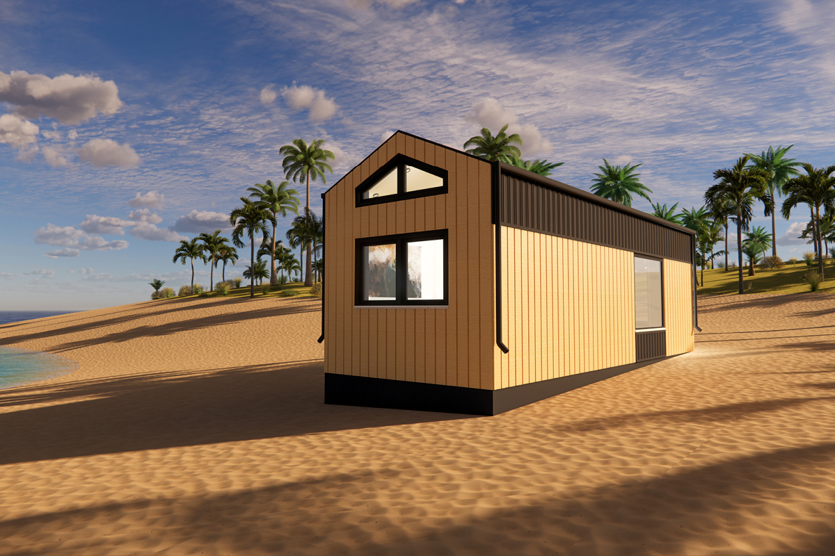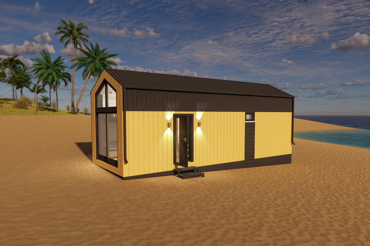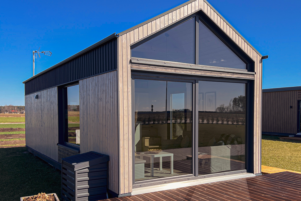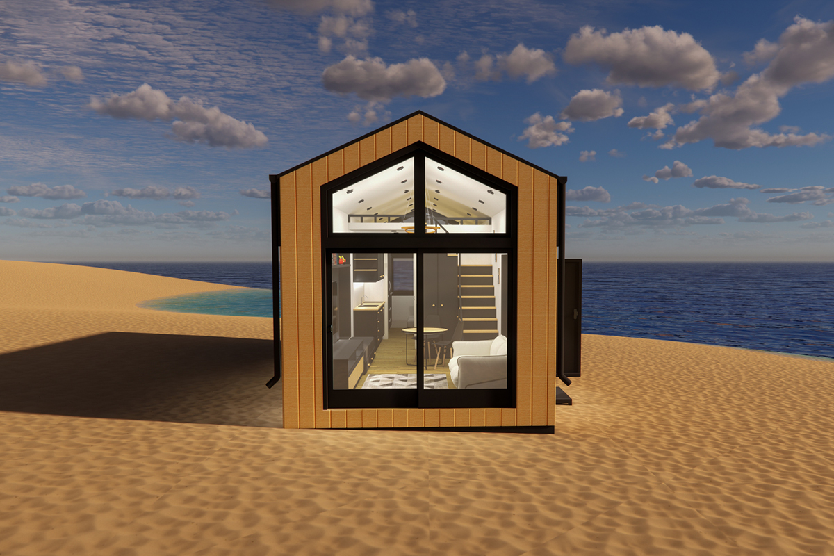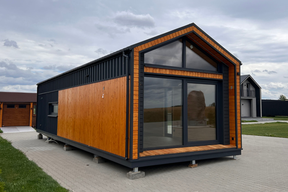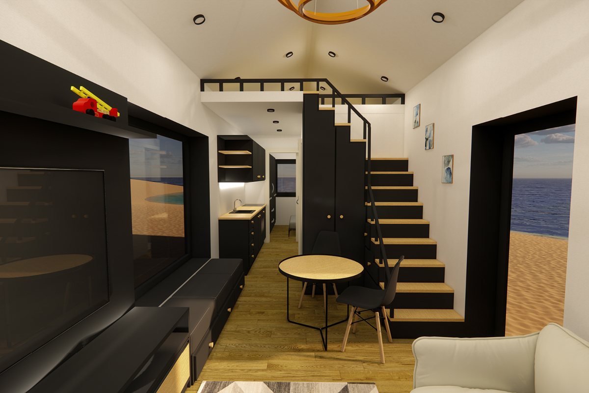 Unser Tiny House 35 vereint Stil, Komfort und Energieeffizienz auf knapp 30 m². Es bietet alles, was Sie für modernes Wohnen brauchen: Küche, Schlafzimmer, Wohnbereich mit großer Fensterbank, Esstisch, Badezimmer und clevere Stauraumlösungen. Die Raumhöhe von über 3,5 m sowie ein geschobenes Fensterelement sorgen für ein beeindruckendes Raumgefühl.