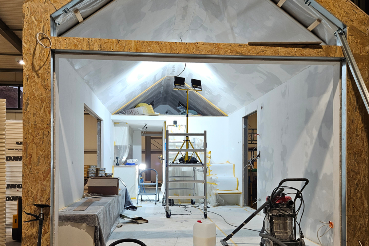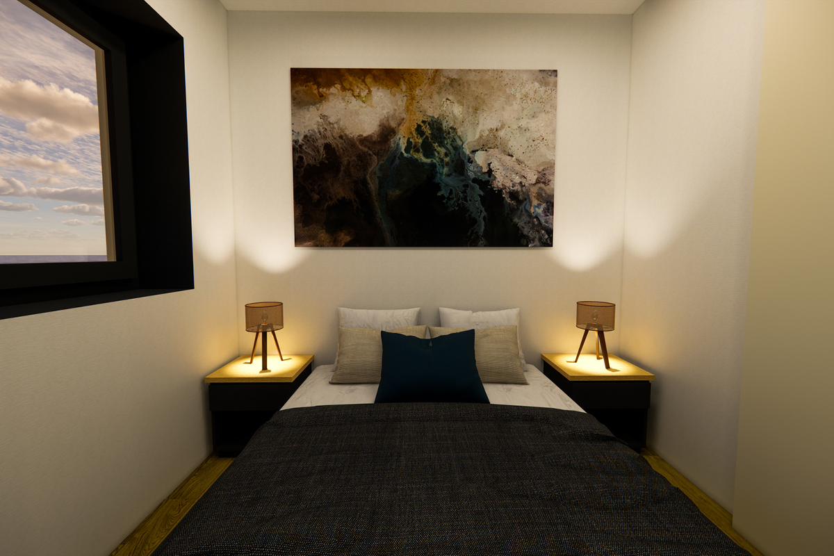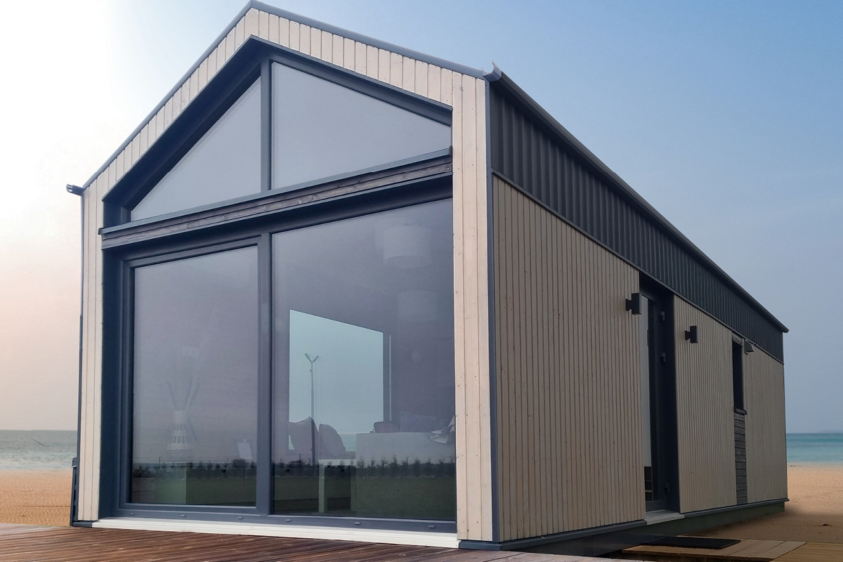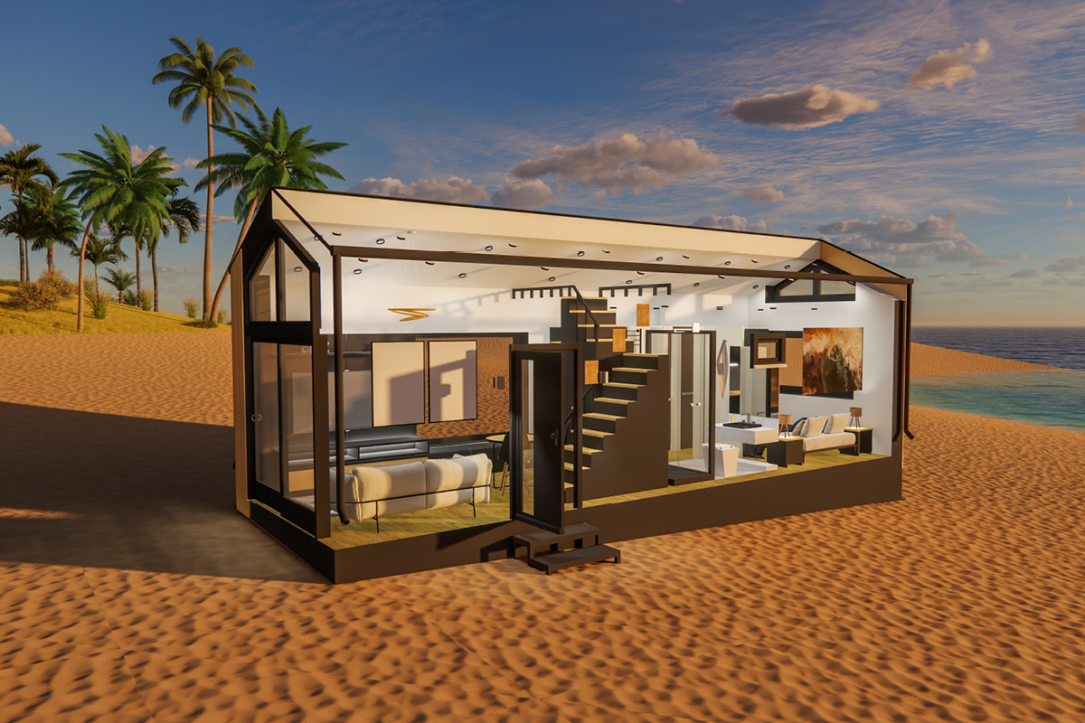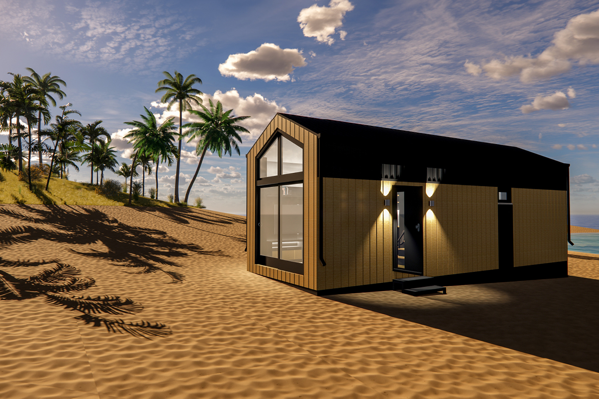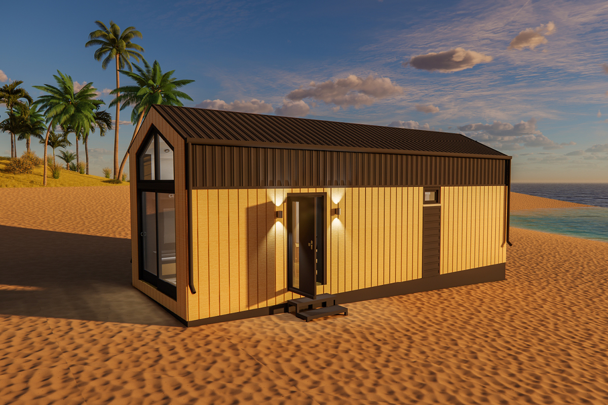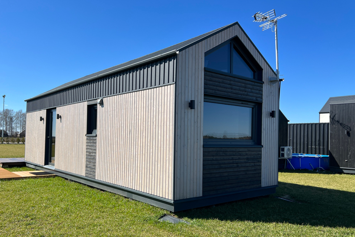 Unser Tiny House 35 vereint Stil, Komfort und Energieeffizienz auf knapp 30 m². Es bietet alles, was Sie für modernes Wohnen brauchen: Küche, Schlafzimmer, Wohnbereich mit großer Fensterbank, Esstisch, Badezimmer und clevere Stauraumlösungen. Die Raumhöhe von über 3,5 m sowie ein geschobenes Fensterelement sorgen für ein beeindruckendes Raumgefühl.