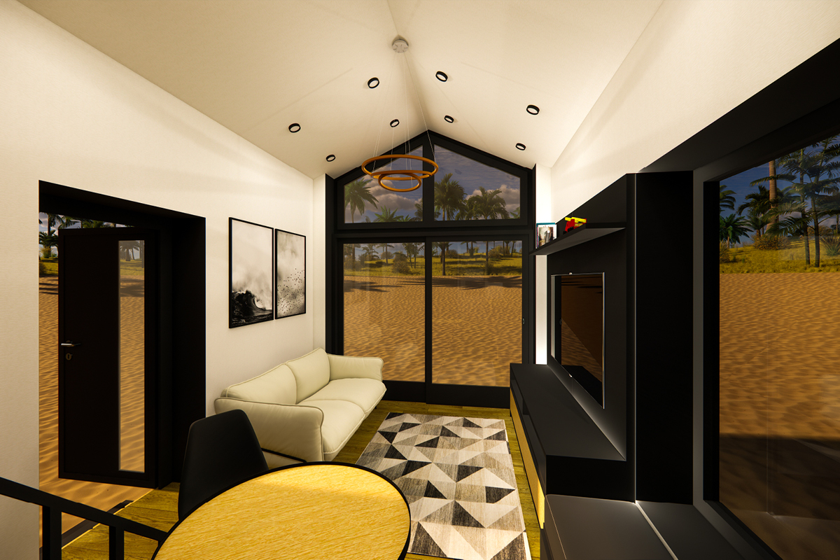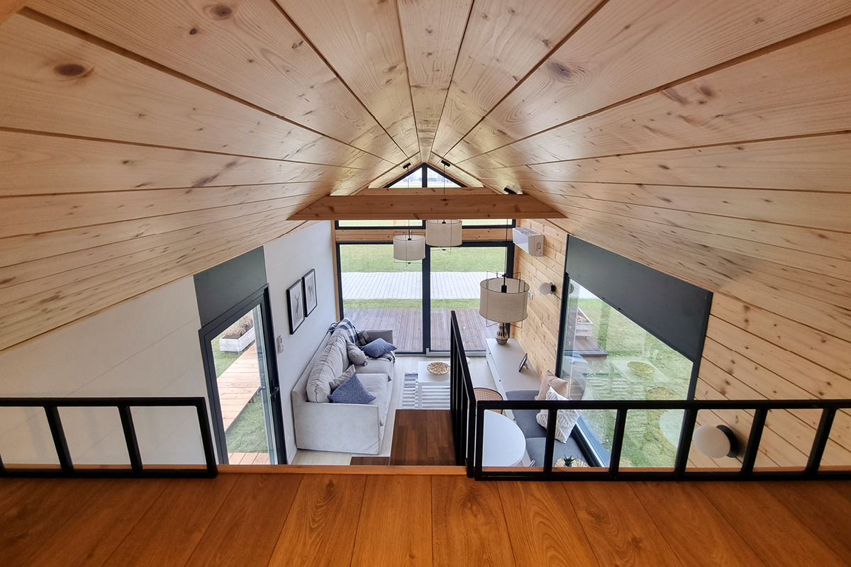 Die TH35 wurde mit Fokus auf Modularität, Anpassbarkeit und Alltagstauglichkeit entworfen. Ein verspieltes Mezzanin bietet Schlaf- oder Freizeitfläche. Unsere hochwertige modulare Bauweise erfüllt deutlich über den gesetzlichen Mindeststandard. Sie können zwischen Ausbauhaus oder komplett eingerichtetem Haus wählen – ganz nach Ihren Wünschen.