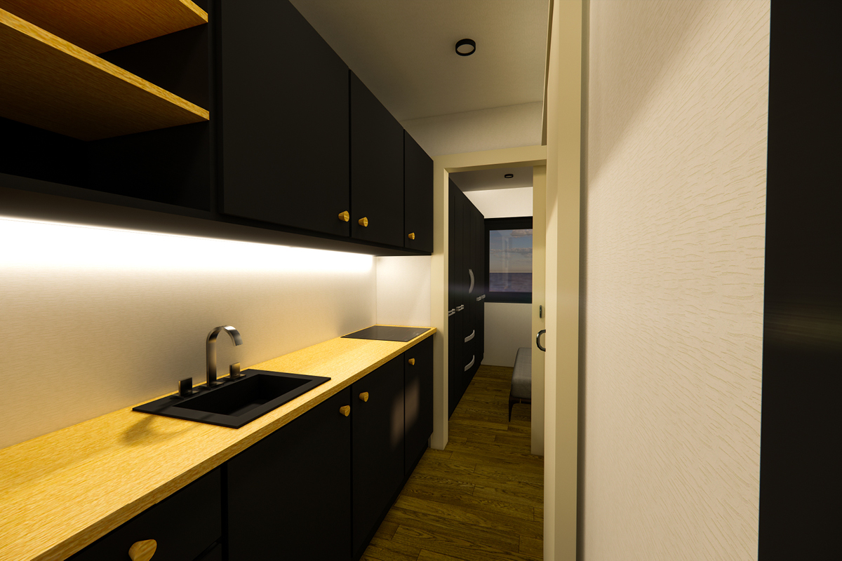 - Moderne Küche und Badezimmer in kompakter, aber effizienter Anordnung