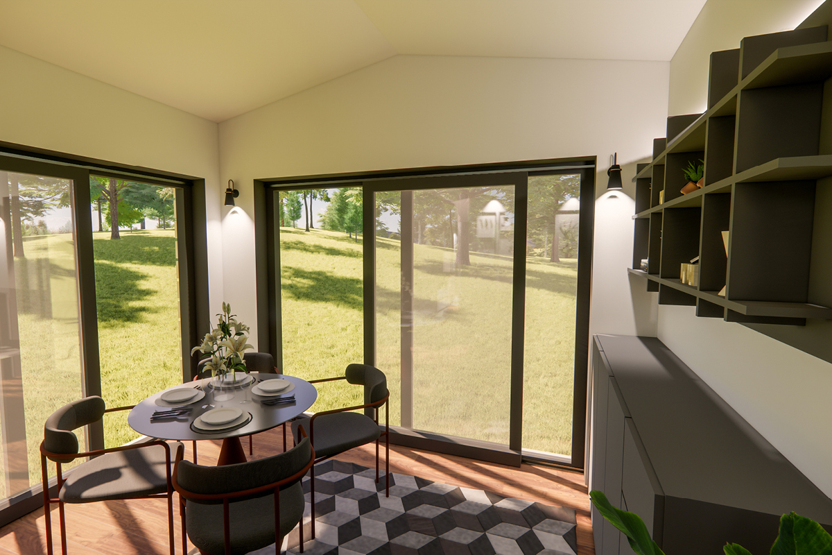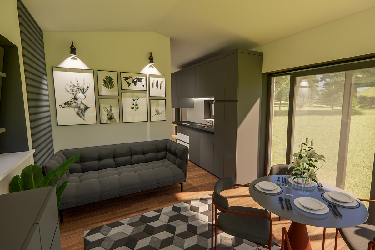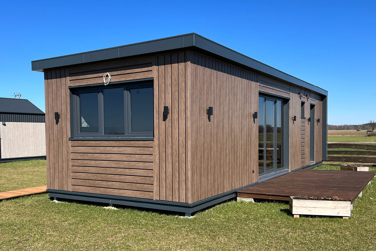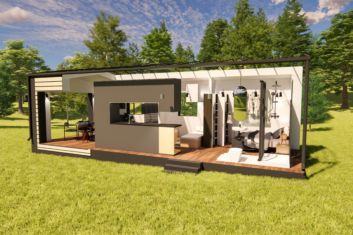 Unser Tiny House 40 bietet großzügige 40 m² Wohnfläche mit modernem Design und optimaler Raumnutzung. Voll ausgestattete Küche, gemütliches Schlafzimmer, Wohnzimmer mit großen Fensterelementen, Esstisch, Badezimmer und smarte Stauräume sorgen für ein komfortables Wohngefühl.