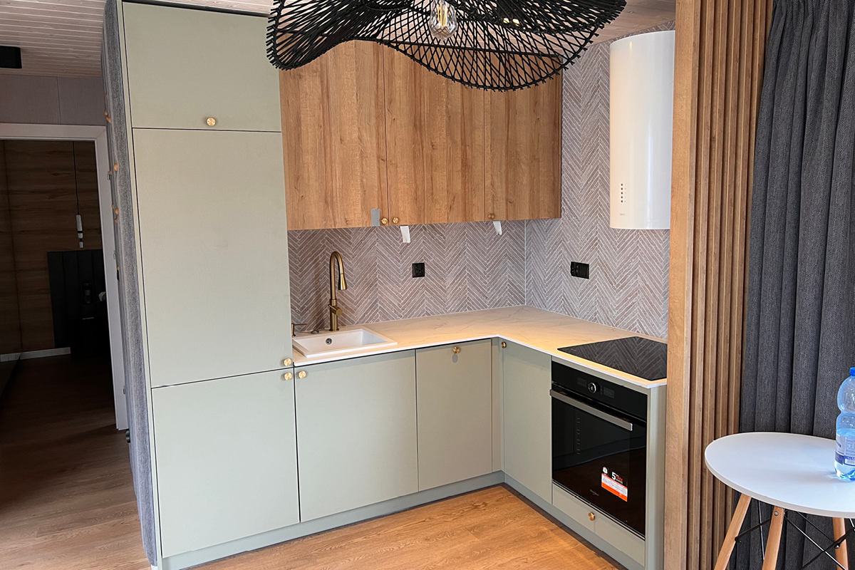 - Hochwertige Materialien mit Holzoberflächen und klaren Linien für ein modernes Ambiente
